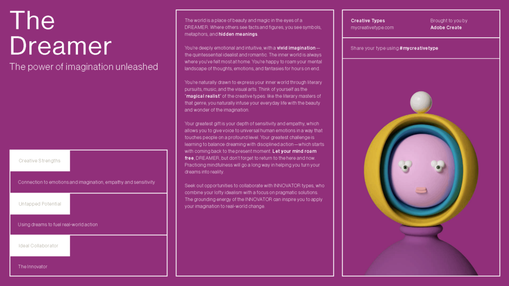 Adobe Create推出的这个Creative type测试主要是以心理学研究为基础,来评估我们日常的生活习惯和倾向。通过这个测试,能帮助我们深入了解我们的内心和认知,以及了解我们个人天赋和能力。除此之外,它鼓励我们发挥自己强项以和潜力在生活上或工作上,以及我们可以更好地面对挑战!
